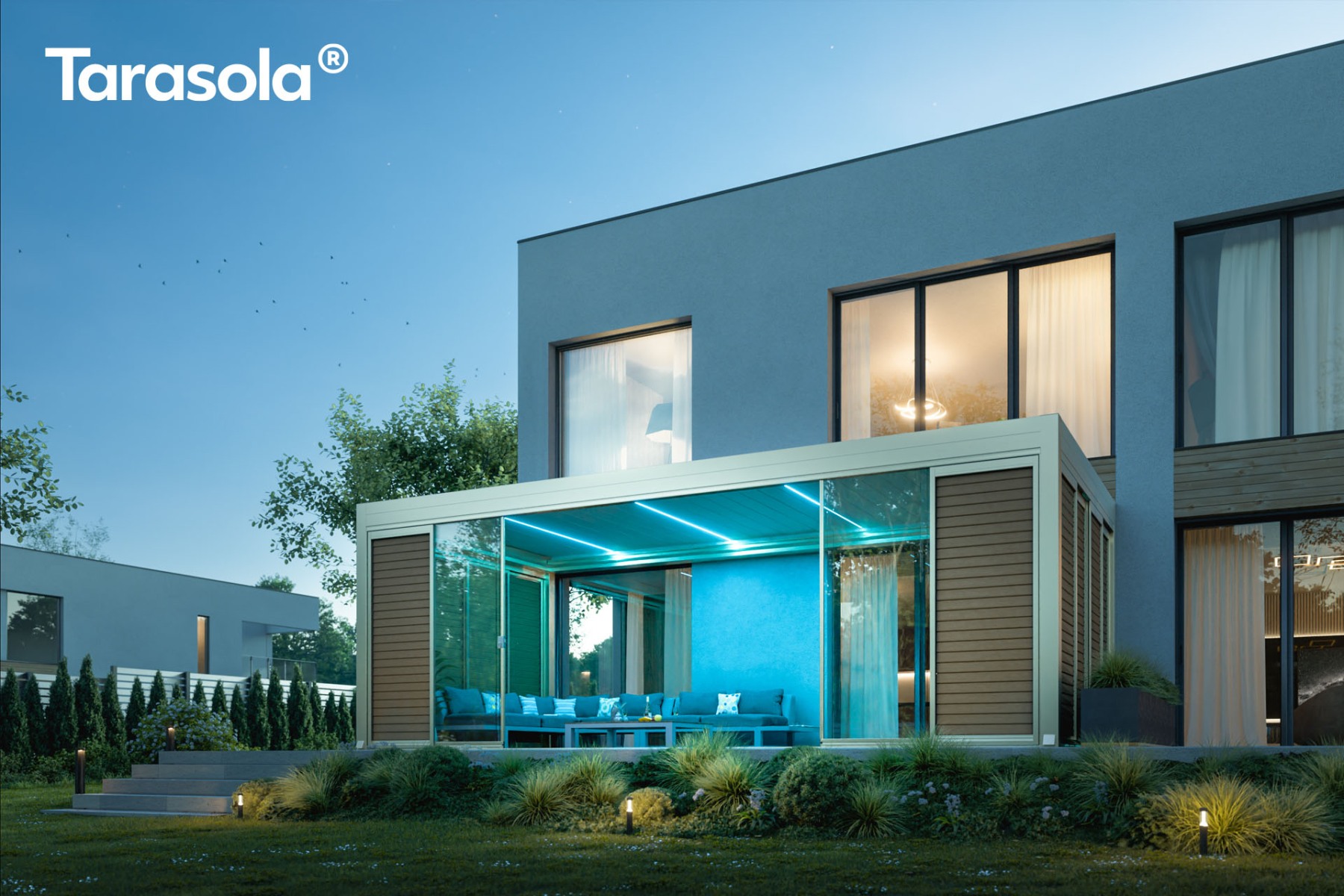 Całe okablowanie jest dyskretnie ukryte w konstrukcji, co zapewnia estetyczny wygląd i spójność z nowoczesnym designem tarasoli. Oświetlenie zostało zaprojektowane zgodnie z aktualnymi trendami i doskonale komponuje się z każdym typem zadaszenia.