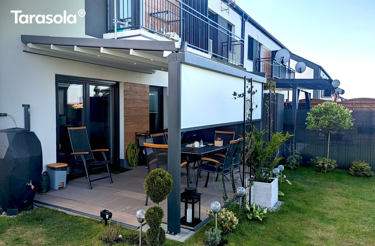 Pergola Simple dostępna jest wyłącznie w wersji przyściennej i najlepiej sprawdzi się na małych oraz średnich tarasach.
